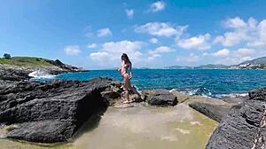brown girl with big fake boobs on her knees at beach, then pussy destroyed at home 😈