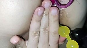 How does slut Yessica Bunny push candy from her asshole before enjoying double anal penetration with three big cocks?