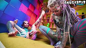 Heavy Tattooed Lesbians Ride Huge Dildos Anal to Mouth Punk Goth Hippie Split Tongue Action