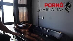 Brazilian housewife with big tits and tan lines cheats in bedroom. She swings with young gym personal trainer in ripped clothes.